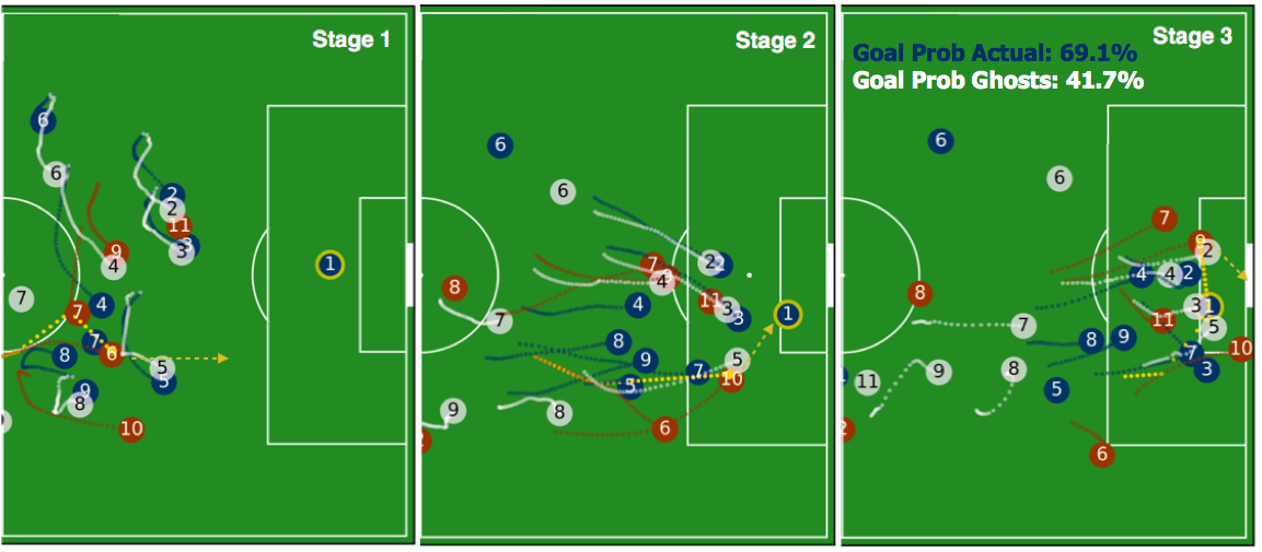 Thanks to their access to 100 games of English Premier League player tracking data, they focused on “ghosting” an EPL team’s defense, using about 17,400 sequences of attacking-defending game clips. Just as the Raptors’ staff had done manually, Lucey and Carr’s team was able to model what a “league average” team of defenders would do as compared to the actual reactions of a single team. Better yet, they could also isolate and ghost how the best defensive team in the league would react to the same attacking play. For both the actual defenders in that game and the league average ghosts, their expected goal value (EGV), the probability that a goal would be scored, was a disappointing 70%. But when the ghosts of the league’s best defenders were dropped into the same scenario, the EGV dropped to about 40% thanks to more proactive defending decisions.