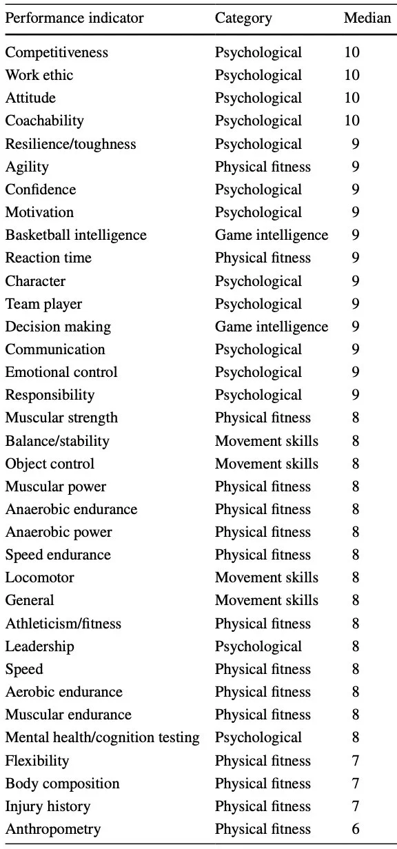 First, they asked the coaches, via an email survey, to name any performance indicator other than raw game statistics (points, assists, steals, etc.) that they use to identify and recruit for their teams. From the overwhelming 608 factors listed, the second round of the study asked the same coaches to rate the options on a 11-point Likert scale, with 0 (no importance) to 10 (extremely important). After compiling the responses, the researchers found 35 indicators with an average rating of at least 6 (important), grouping them into four major categories: physical fitness, psychological, movement skills and game intelligence. The complete list showed the variety of possible ideas: